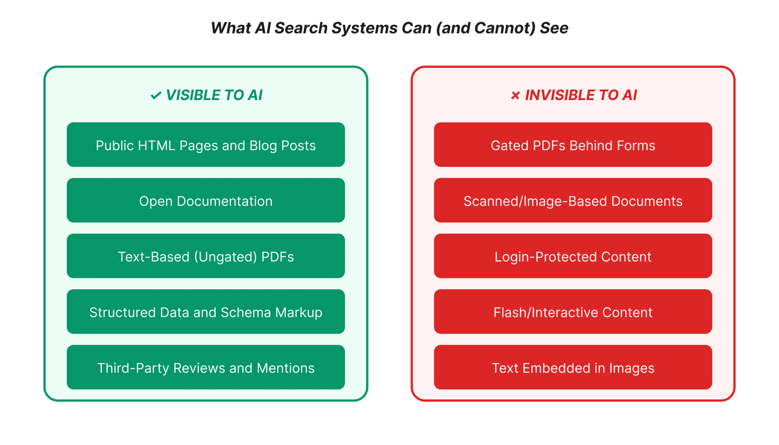 - Gated PDFs and image-based documents cannot be crawled, indexed, or cited by AI search systems