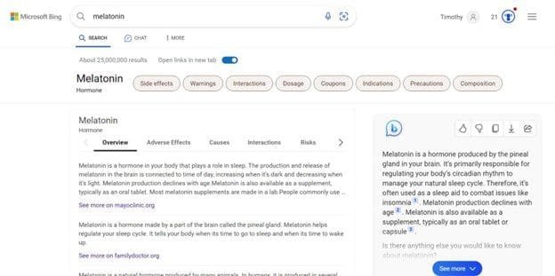 As seen in the above screenshot, the searcher can learn about the adverse effects, causes, and risks associated with melatonin without visiting any of the websites the information was drawn from, including Mayo Clinic and Family Doctor.