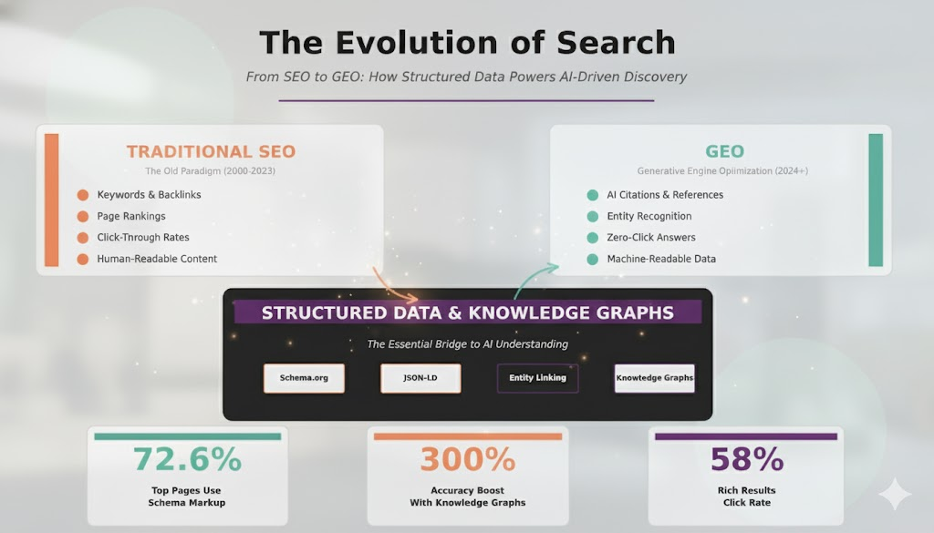 Welcome to the era of Generative Engine Optimization (GEO), where the rules have been rewritten, the metrics have changed, and the winners are those who speak the language that AI models actually understand: structured data and knowledge graphs.
